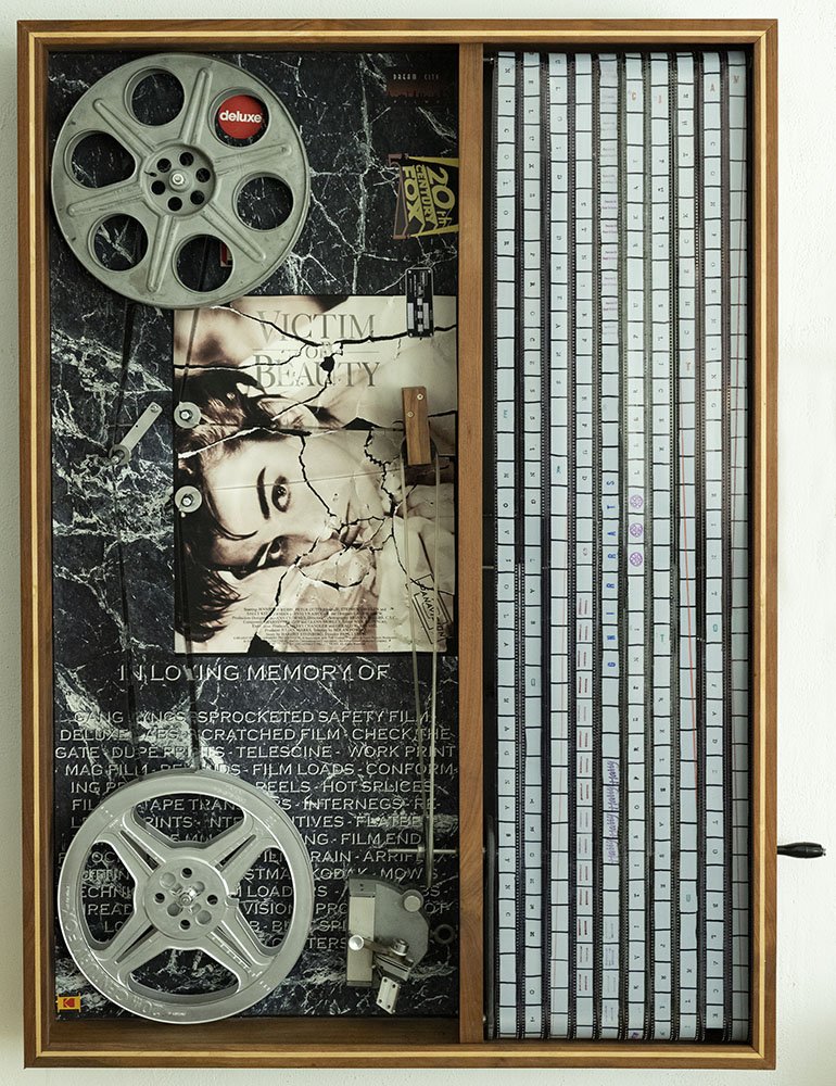 Fade to Memory, 48”w x 60”h x 6”d. Framed walnut box, 35mm film hand painted in two separate loops, sprockets, rollers, film reels.